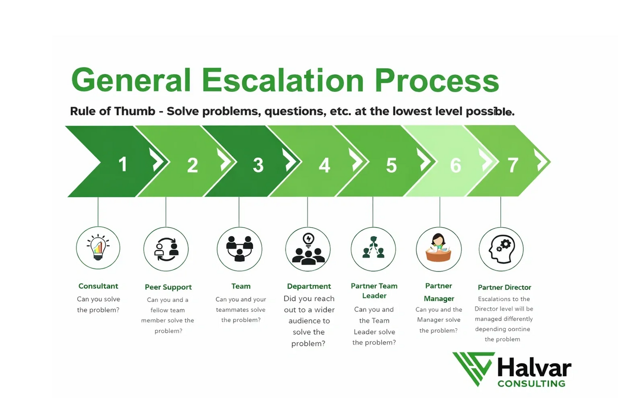 Partners receive a single point of contact for escalation and full accountability across all assigned resources. Internally, our consultants are supported by senior leadership and subject matter experts, ensuring most issues are resolved before formal escalation. In practice, the majority of delivery challenges are addressed through internal collaboration, preserving program momentum and protecting client confidence.